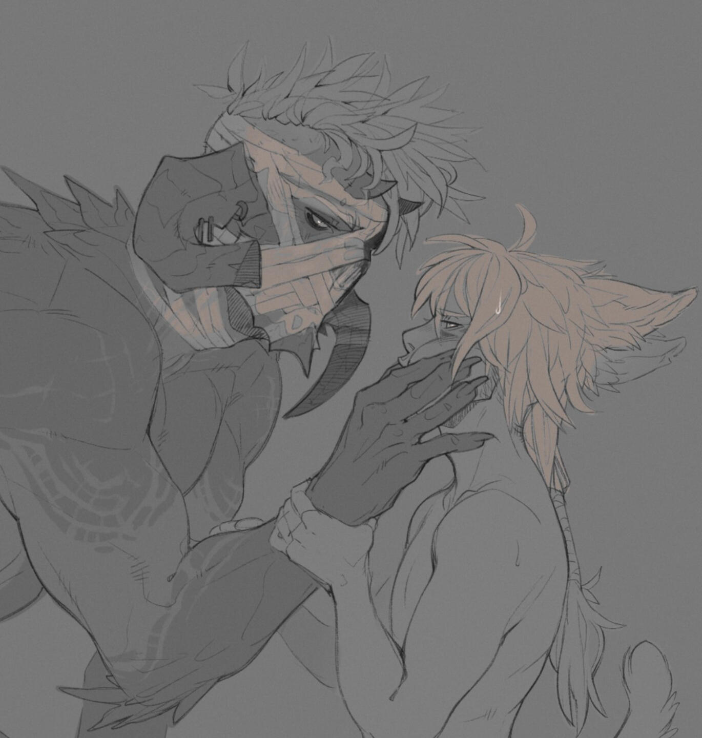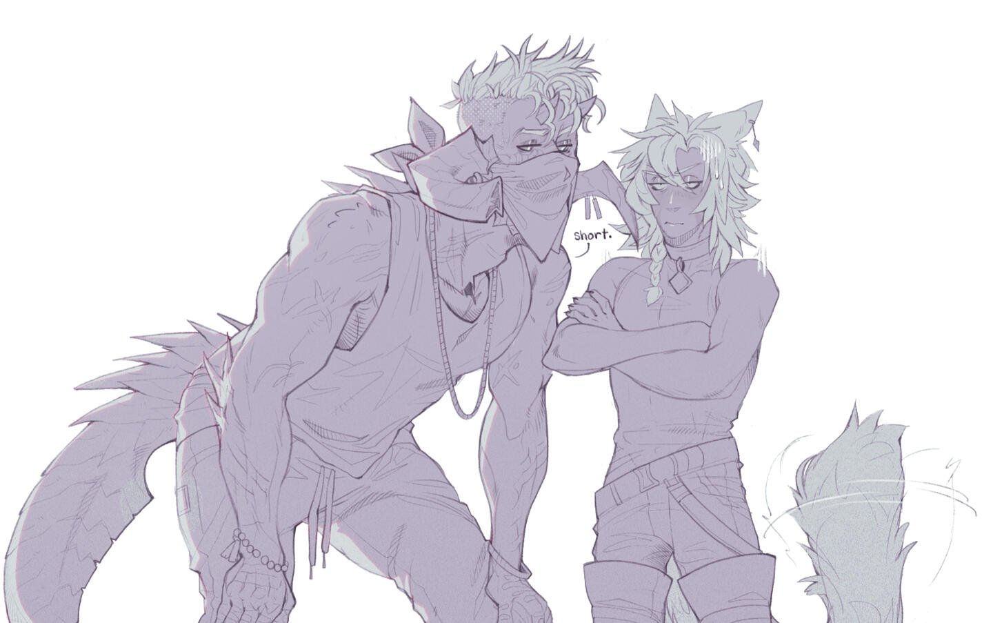 His past with his old tribe isn't remembered fondly. His time and responsibilities mainly consisted of basic survival skills - fishing and the butchery of hunted creatures. Due to this Sourie is not keen on most animals he encounters, and barely understand the concept of 'pets' or 'mounts' outside livestock. If you can't eat it what's the point?While he was with his tribe, Sourie was deeply romantically involved with another member. He will avoid this topic at all costs and prying into it sends the xaela into a rage -- or worse, he shuts down completely.
