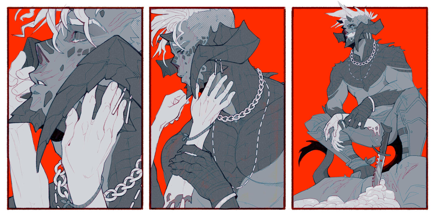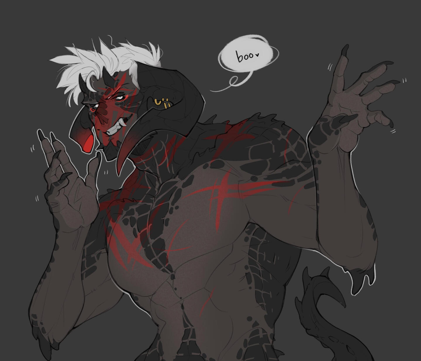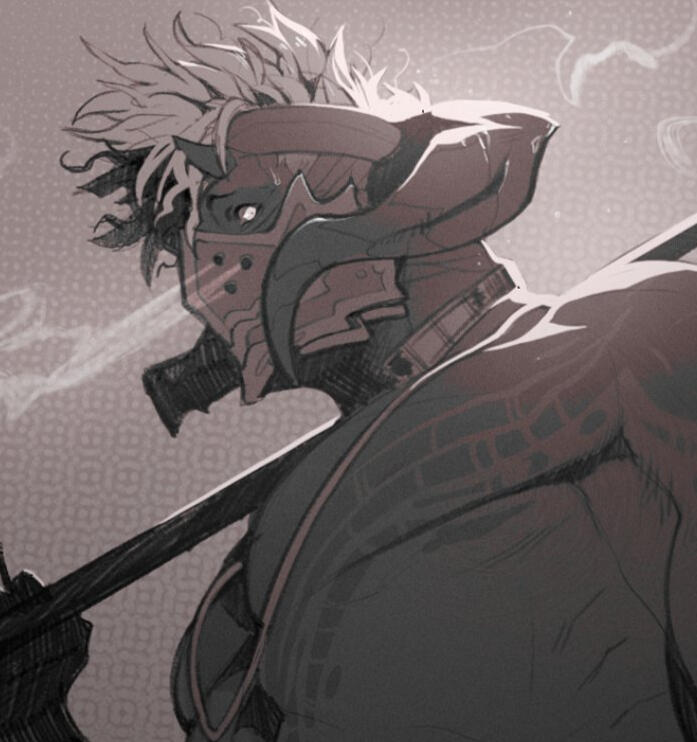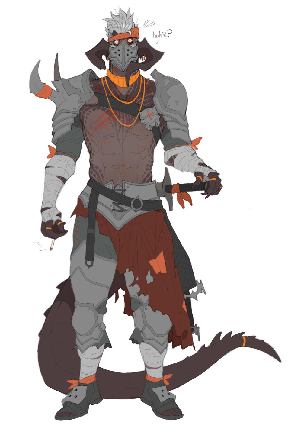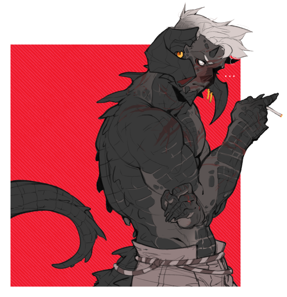 Misc: Sourie is a large adult male Au Ra covered in dark, boxy scales that protrude unusually from his elbows and spine ridge. One of his horns has been shattered, and he has collected a suspiciously large number of knotted scars and injuries on his upper torso and head, though the majority seem to have healed long ago.Most of the time, the xaela wears a mask or bandanna pulled up over the ruined remains of what was once his nose. While the wound is one of his most notable features, he seems unwilling to speak much on the topic when pressed, beyond making light jests and a quick subject change.